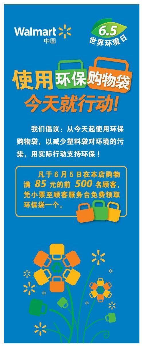 北京2012年6月4日電 /美通社亞洲/ -- 今年6月5日“世界環境日”當天,沃爾瑪在全國范圍內啟動了“使用環保購物袋,今天就行動”主題活動。沃爾瑪全國370余家門店共同向顧客發出了使用環保購物袋的倡議,并在全國各大超市免費向顧客派發共計近200,000個環保購物袋。同時,沃爾瑪還向全體員工發出從“世界環境日”這一天開始循環使用環保購物袋的倡議。為配合今年世界環境日中國主題“綠色消費,你行動了嗎”,沃爾瑪再次推出“減塑”倡議,希望通過該系列活動引導消費者的綠色消費理念,建立可持續的消費行為。