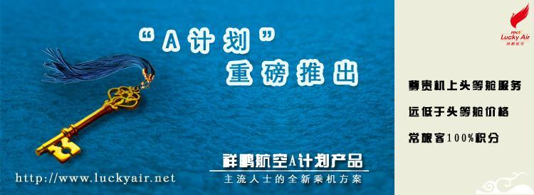 “A計劃”產品是祥鵬航空官網推出的另一項超值服務產品。只要是標注有“A計劃”字樣的機票,旅客均能以遠低于頭等艙的銷售價格購買,并享受切實的頭等艙待遇。如尊享頭等艙座位、頭等艙餐食及相應的頭等艙空中服務,海航金鵬俱樂部會員積分按照經濟艙的100%標準累積計算等,是真正的價格有折扣,服務有升值。
