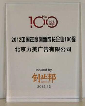 北京2012年12月10日電 /美通社/ -- 近日,由創(chuàng)業(yè)邦 (cyzone.cn) 主辦的“2012創(chuàng)業(yè)邦年會(huì)暨‘創(chuàng)業(yè)邦100’年度頒獎(jiǎng)典禮”在北京千禧大酒店隆重舉行。本屆年會(huì)以“夢(mèng)想照亮現(xiàn)實(shí)”為主題。經(jīng)過激烈的角逐與多方評(píng)估、審核,國內(nèi)領(lǐng)先的移動(dòng)營銷解決方案提供商 -- 力美廣告?zhèn)髅?/a>,憑借其創(chuàng)新且領(lǐng)先的綜合實(shí)力,喜獲“創(chuàng)新成長企業(yè)100強(qiáng)”稱號(hào)。